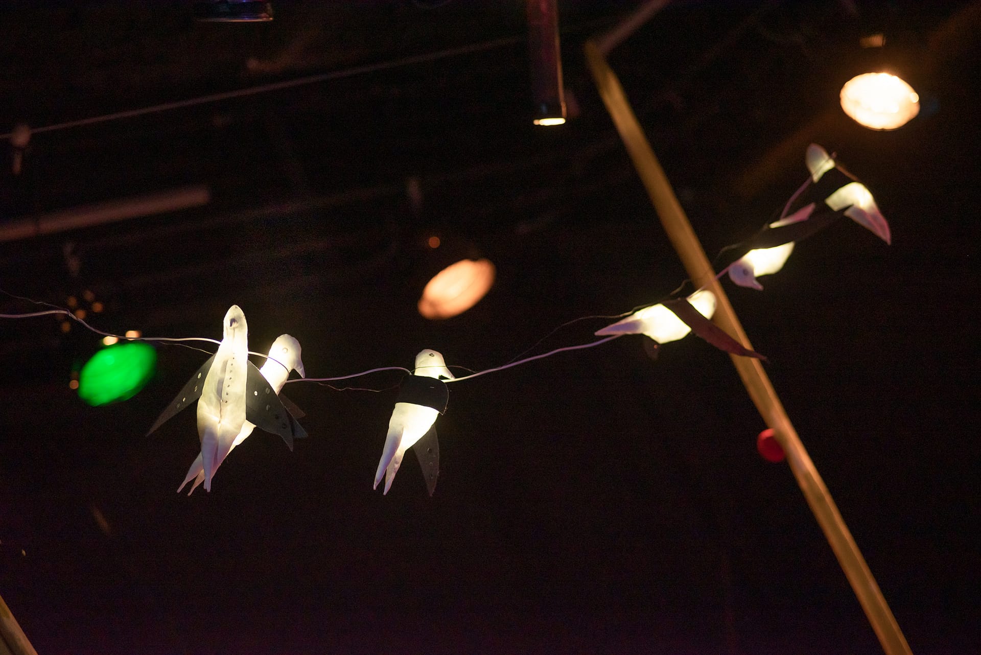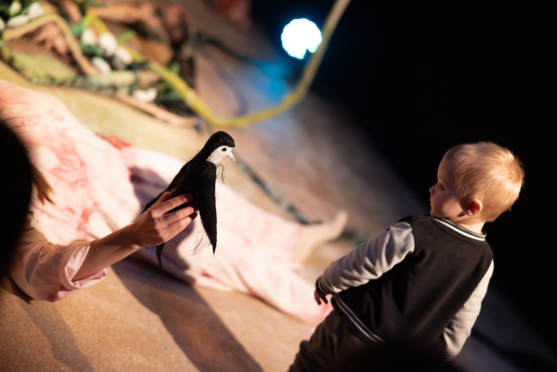 Фьють… и в руках актеров летают ласточки… Фьють! И сами актеры превращаются в большую птицу… Фьють! И маленькие зрители оказываются внутри сцены, где парят огромные крылья, цветут лианы и рассыпаются яркие ягоды.
