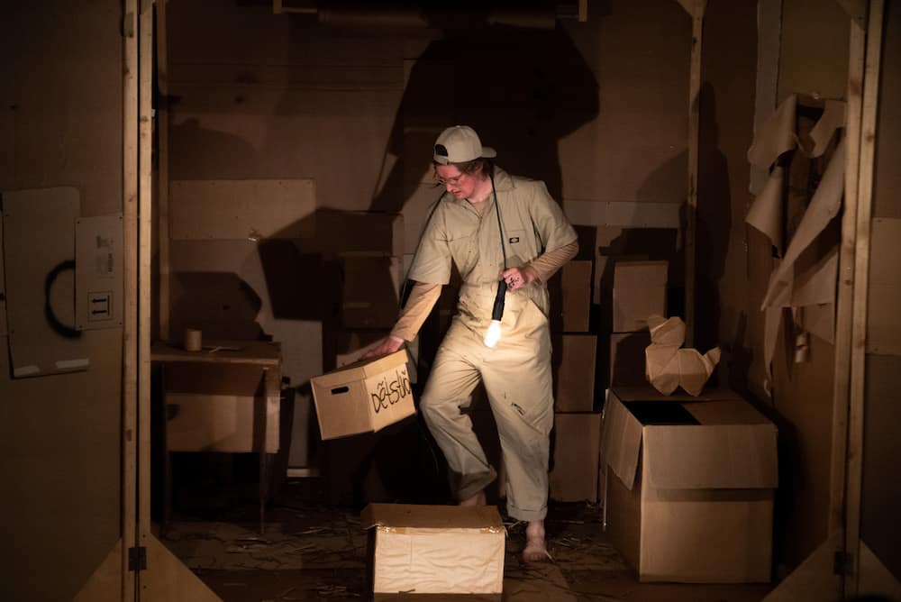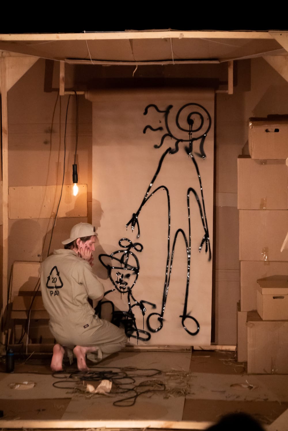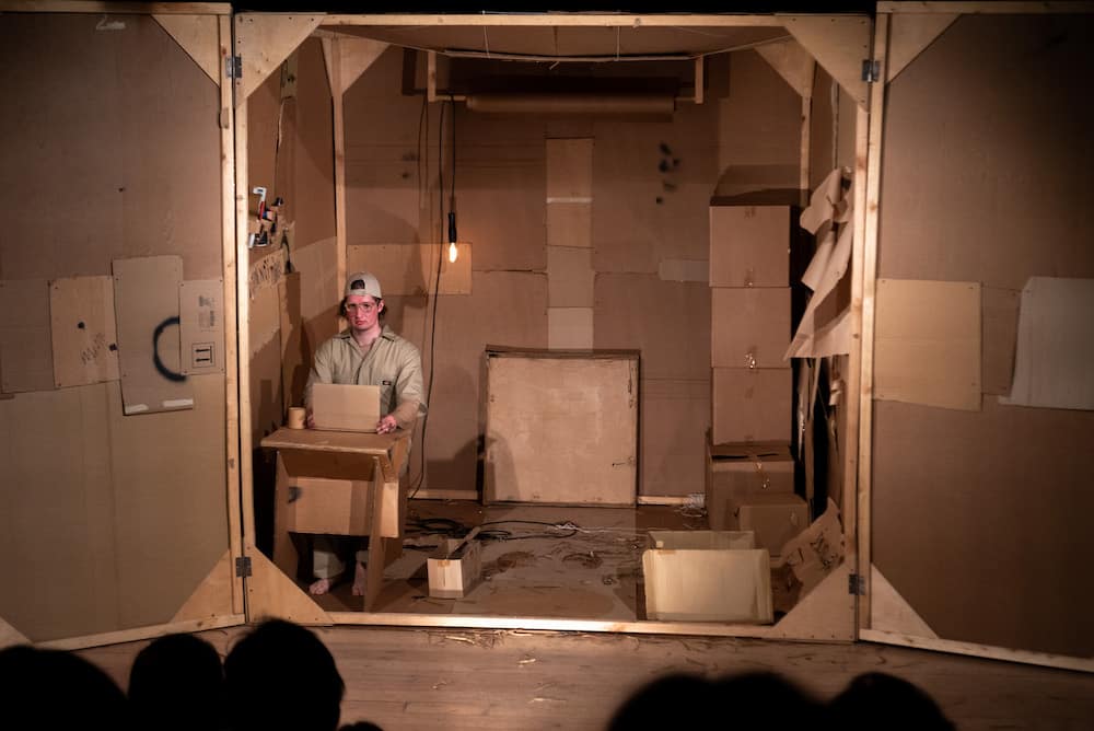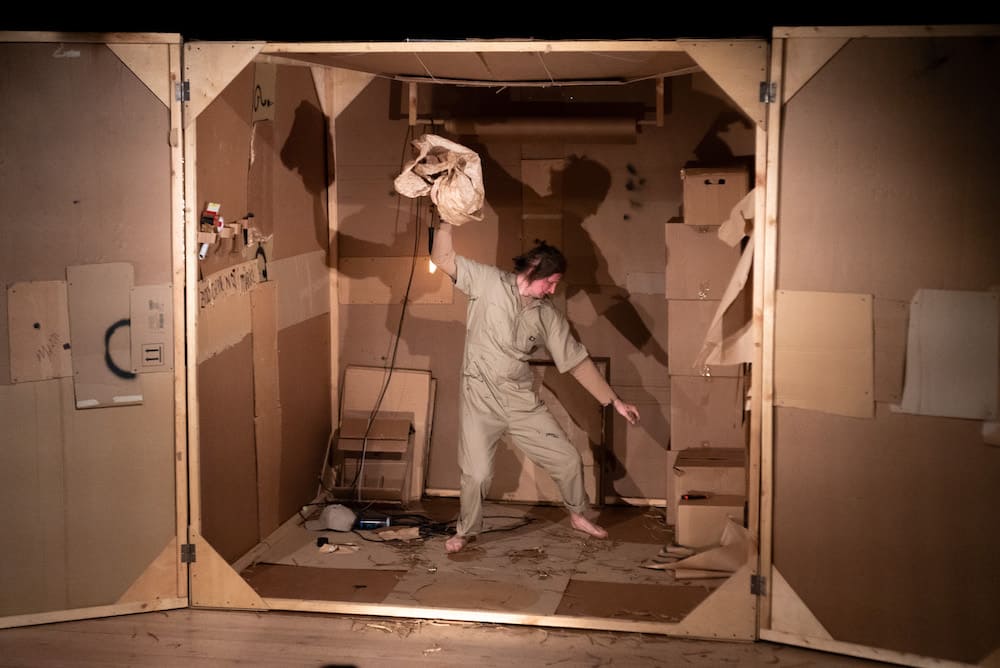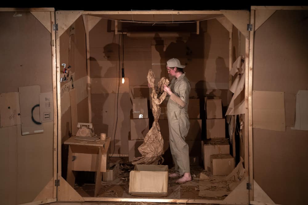 Картон в этом спектакле – главное действующее лицо и основной предмет исследования. Зрители  узнают, как бумажное сырье превращается в готовый продукт, а затем, придя в негодность, вновь становится сырьем. Проводником по этому хрупкому миру выступает «картонный человек», жизнь которого от детства до старости является составной частью действия. Устройство картонной коробки, ее внутреннее пространство, взаимодействие с другими такими же коробками оказывается одновременно реальностью спектакля и источником мифотворчества.