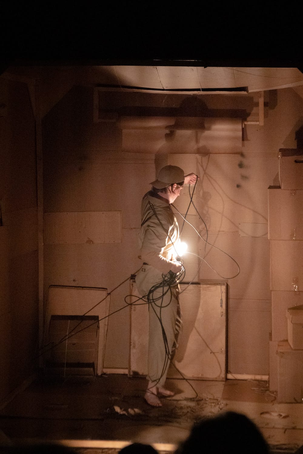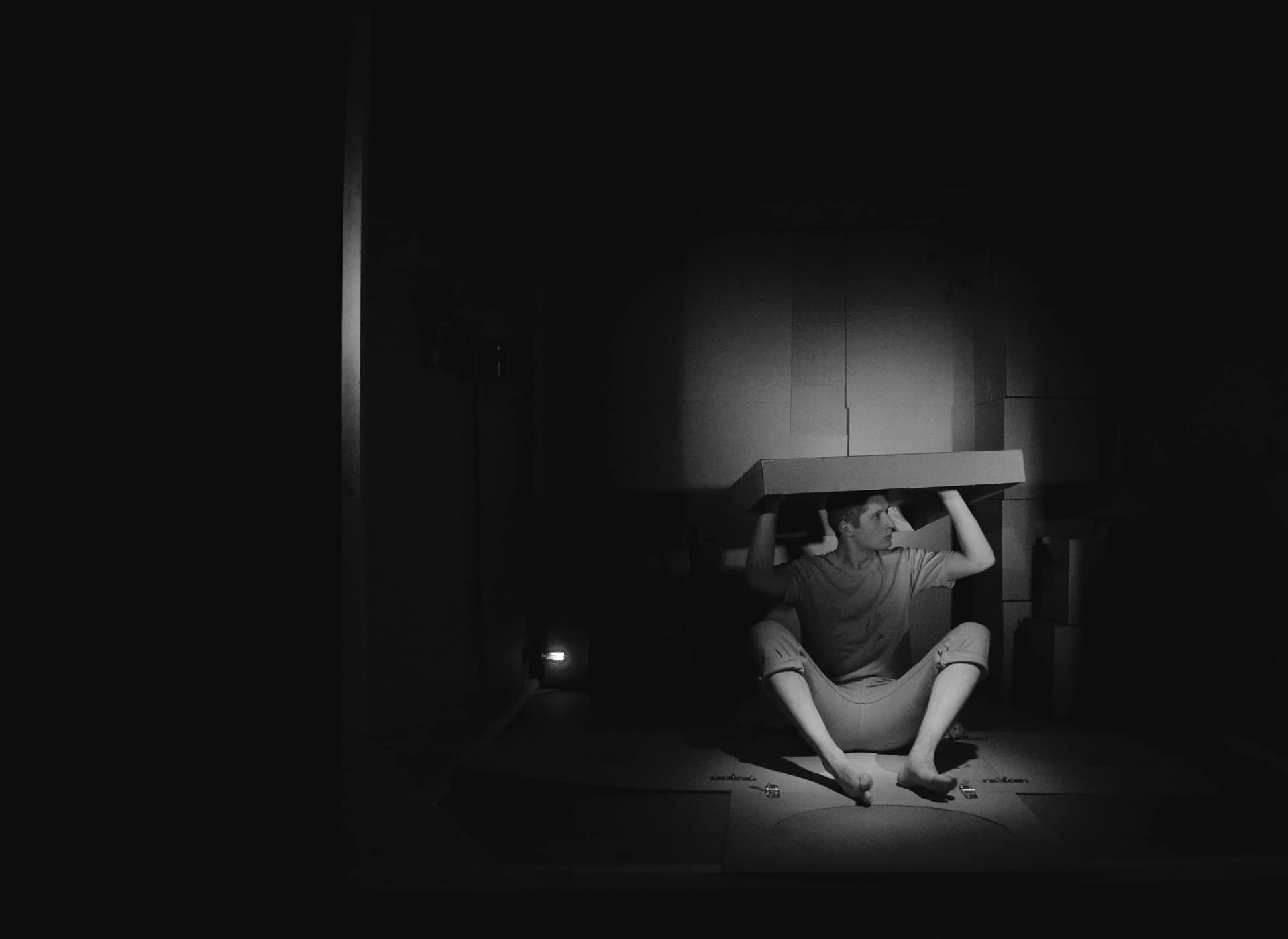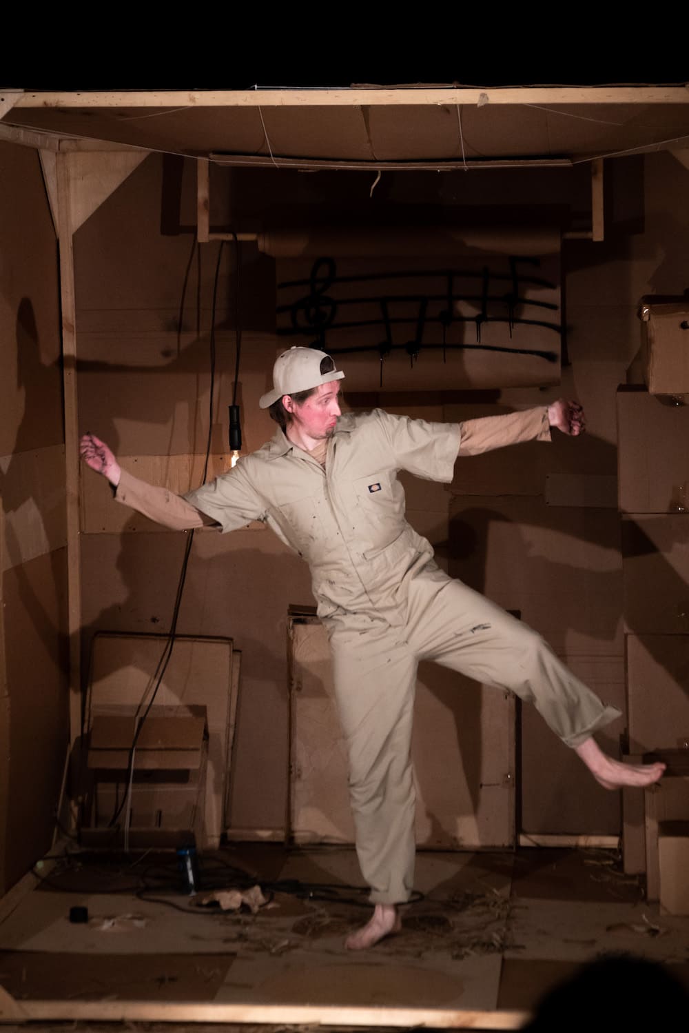 Картон в этом спектакле – главное действующее лицо и основной предмет исследования. Зрители  узнают, как бумажное сырье превращается в готовый продукт, а затем, придя в негодность, вновь становится сырьем. Проводником по этому хрупкому миру выступает «картонный человек», жизнь которого от детства до старости является составной частью действия. Устройство картонной коробки, ее внутреннее пространство, взаимодействие с другими такими же коробками оказывается одновременно реальностью спектакля и источником мифотворчества.