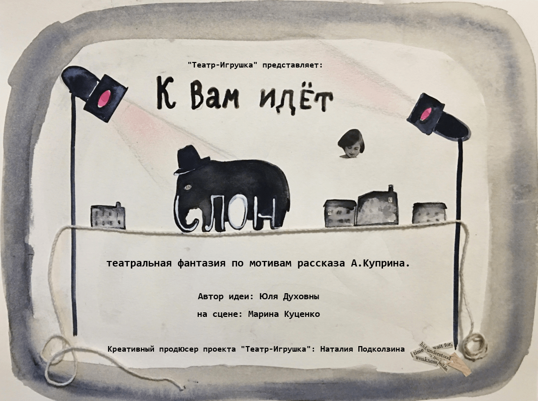 Автор идеи, Юля Духовны, обращается к теме известного сюжета не впервые. Её собственный «Театр Микроскоп» (Microscope Toy Theater), начинался именно с этих героев: Девочка и Слон. Тогда сценой служил чемодан, в котором «играли» чуть наивные бумажные куклы, напоминающие вертепных. Год назад проект «Театр-Игрушка» предложил Юле придумать драматический спектакль, в котором рассказ Куприна станет лишь проводником в мир маленького искреннего человека, ребёнка. История зазвучала по-новому!